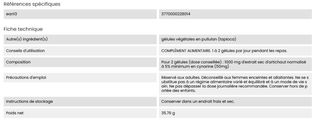 -> Garantie Dynveo : sans excipients / sans additifs (poudre d’artichaut seule dans la gélule végétale), garantie non irradiée, sans OGM, naturellement sans levure, sans gluten, sans dérivés laitiers, sans colorants ni conservateurs, sans dioxyde de titane, sans stéarate de magnésium…
