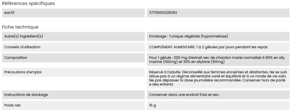 400 mg d’extrait sec de graines de Chardon-Marie bio* pur concentré à plus de 80% en silymarine (320 mg) et plus de 30% en silybine (120 mg). Gélules végétales.